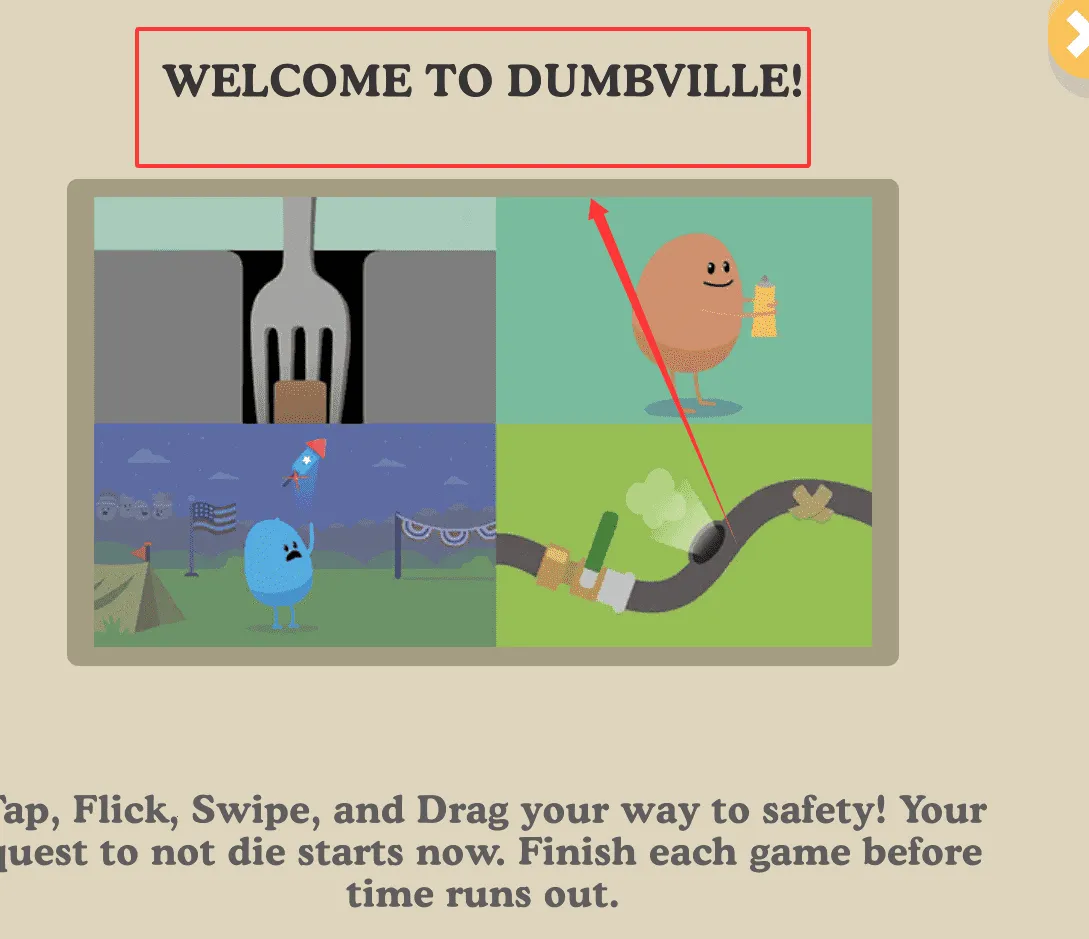 1、首先呢,在主页面点击"START"按钮就能正式进入游戏。然后你会来到"WELCOME TO DUMBVILLE"的教学引导页。
