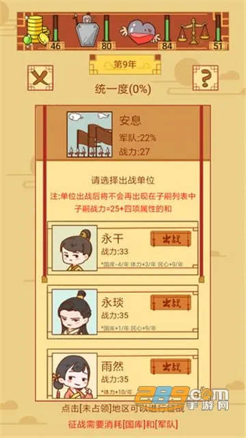 3、玩法简单:维持国库、军队、体力、民心四项数值不低于0即可,无过多复杂操作。