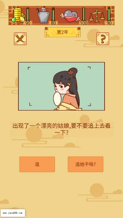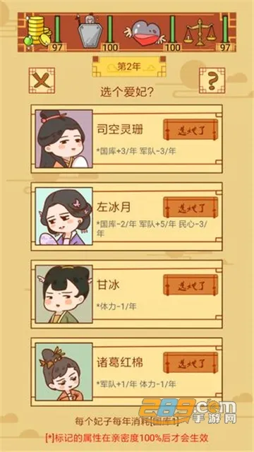 2、该游戏玩法简单,需维持国库、军队、体力、民心四项数值不低于0 ,过程中有选妃、培养太子等丰富剧情。