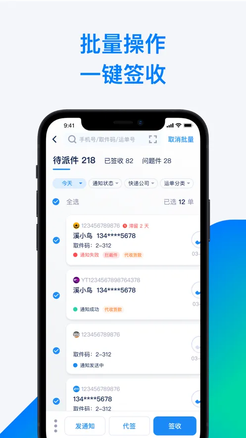 3、智能识别与便捷操作:支持批量扫描运单号,自动识别快递公司名称及特殊运单;大部分运单扫描后带出手机号,结合OCR识别技术,入库效率更高。