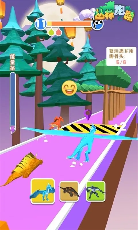 3、特色玩法:以休闲跑酷为基础,融入恐龙元素,需操控恐龙冲刺,通过跳跃、摧毁障碍等方式前进,到达终点可能需战斗,切换形态应对不同攻击。