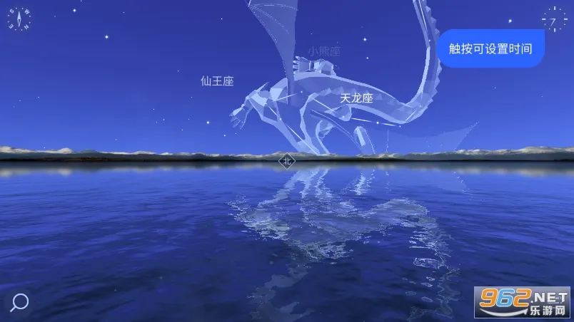 打开软件首次使用需获取当前位置,触按右上角可设置时间,左上角能实时观测上空星星,点击菜单有其他功能,点击左下角放大镜可检索查看星座星系等,还能通过特定操作找到银河。