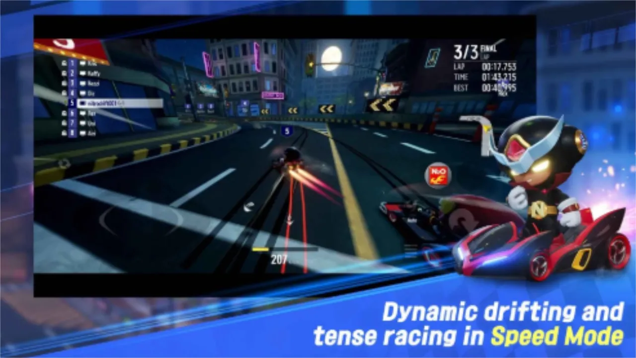 2. 能遇到各种角色和卡丁车,尝试特殊服装和表情展现个性,在独特卡丁车中加速赛道,时尚跨越排行榜。