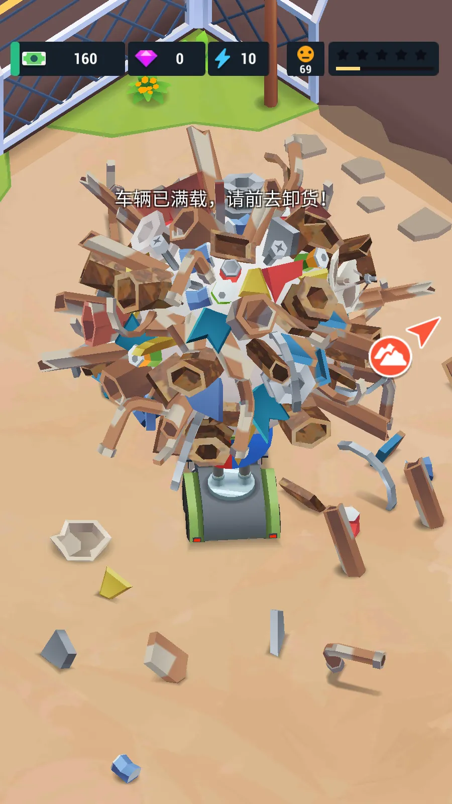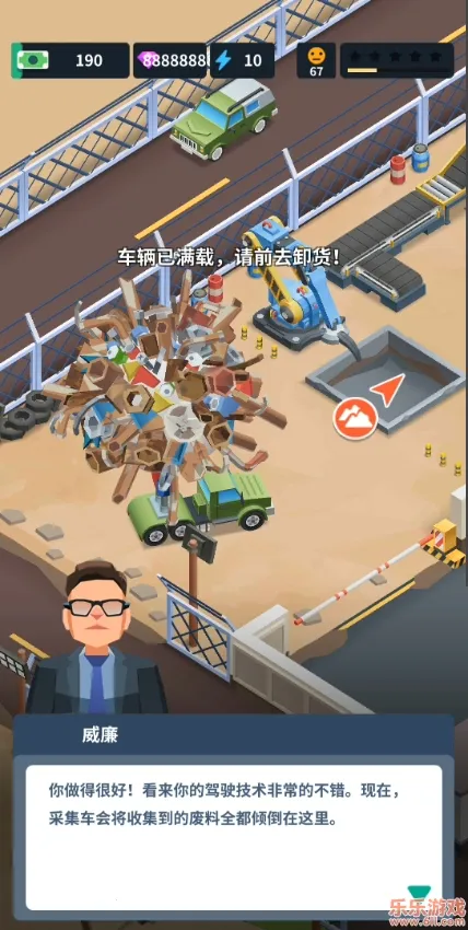 2、玩家通过拖动屏幕,控制车辆收集废料。