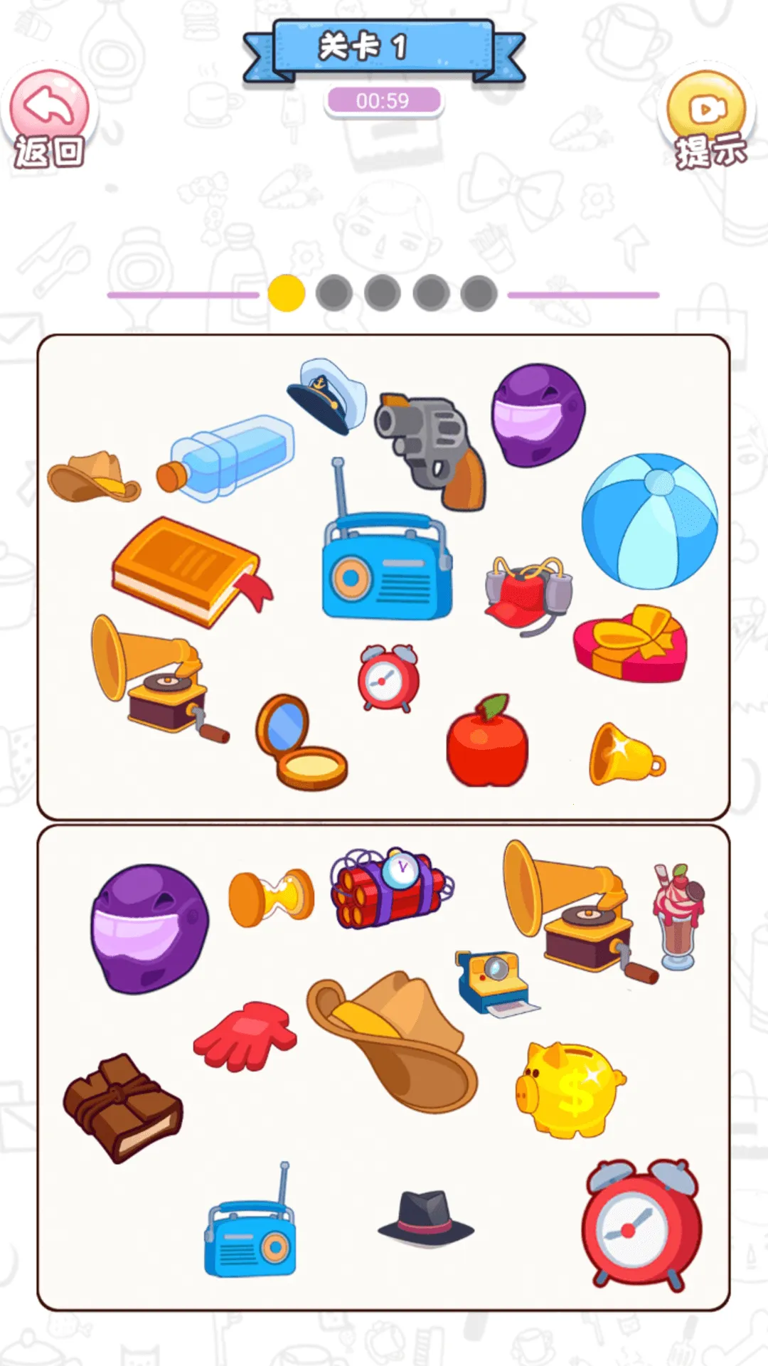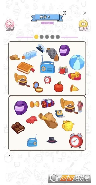 开始游戏先整体浏览图片结构,注意颜色、形状、位置、数量等差异,遇到难发现的茬点可合理使用系统提示功能。