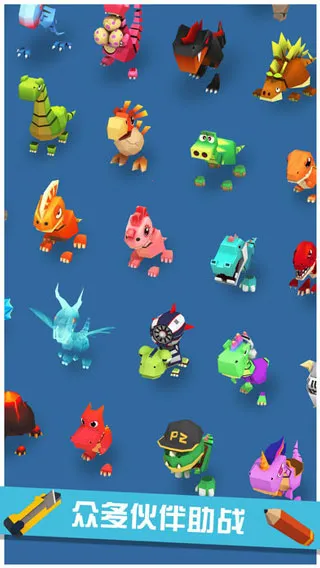 1、多样史前萌物:游戏中包含骷骨龙、涡轮龟、金刚老剑龙等多种史前萌物,与玩家一同冒险。