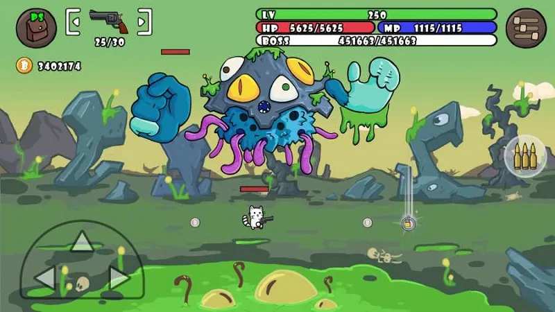 7.在作战界面中,通过左下方的轮盘控制猫咪移动和跳跃,利用右下方的按钮进行射击。