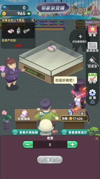1、玩家可通过招揽顾客维持店铺经营,每位到店顾客都会携带不同商品,能根据商品品相判断价值,经多次讨价还价收购商品。