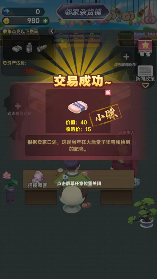 4、当总资产达一定量级可解锁新店铺,随之新商品出现,新玩法如新闻政策拍卖会也陆续解锁。