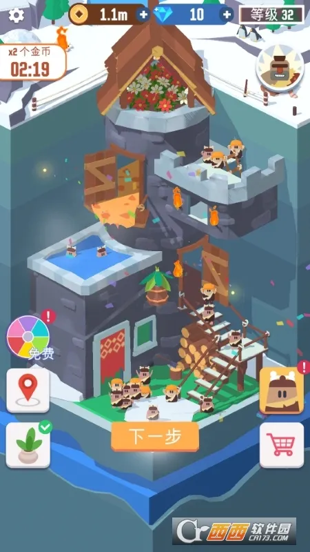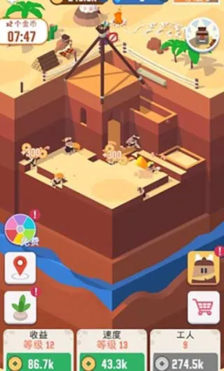 4. 可升级工人数量和属性加快建造速度,工人会偷懒,点击相应图标可唤醒继续工作。能升级收益、速度、工人等,还能针对工人能力升级,增加挖掘效率,并且工人有不同皮肤预设功能,需解锁相应场景才能使用。