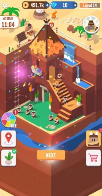 2. 采用轻松休闲的放置类玩法模式,有简洁画面与丰富内容,通过指尖点击操作提升工人挖矿效率获取财富,还能自由建造各种建筑。
