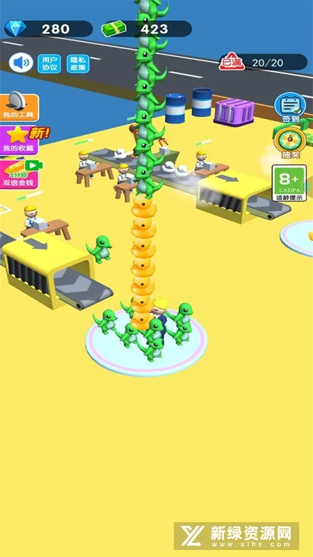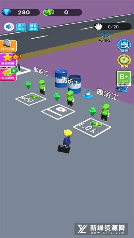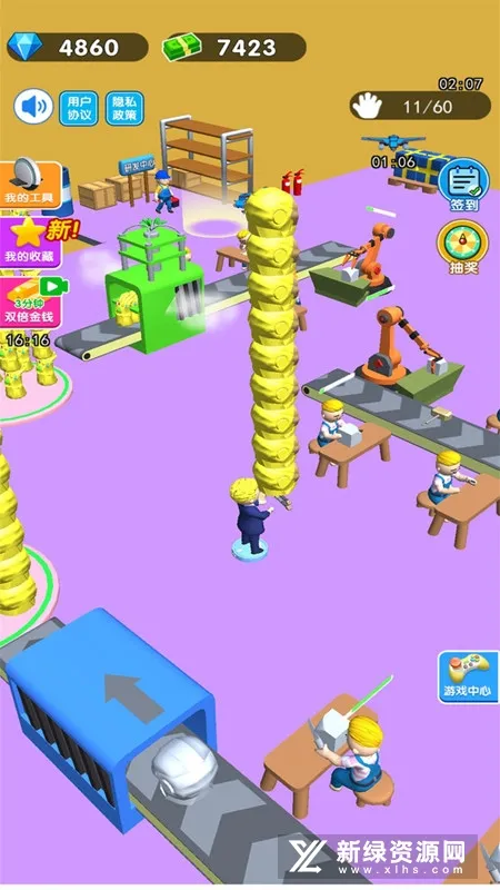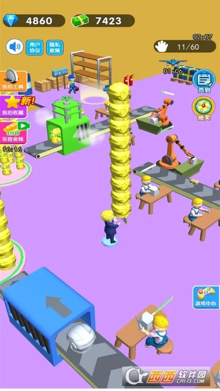 1. 玩家可扮演刚创业的小老板,通过搬运车间生产的玩具赚取第一桶金,赚够金币解锁搬运工人、扩大车间、提升效率,进而解锁不同关卡与车间。