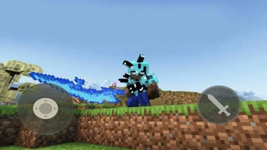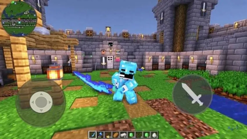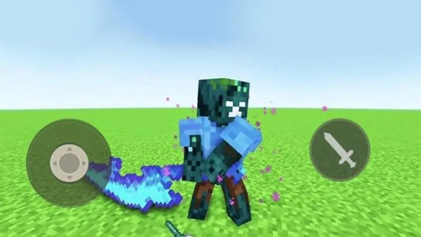 1、操控像素角色,拿着发光大剑在草地城堡等场景折腾奇葩村民,像浑身冒紫光的僵尸样式、冰蓝色搞怪造型等。