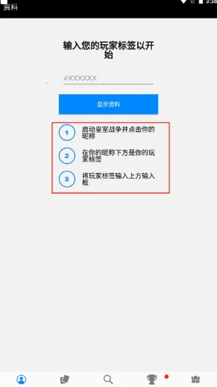 在上方显示XX的地方输入你玩家昵称下方的标签,就能显示您作为皇家战争玩家的所有资料。