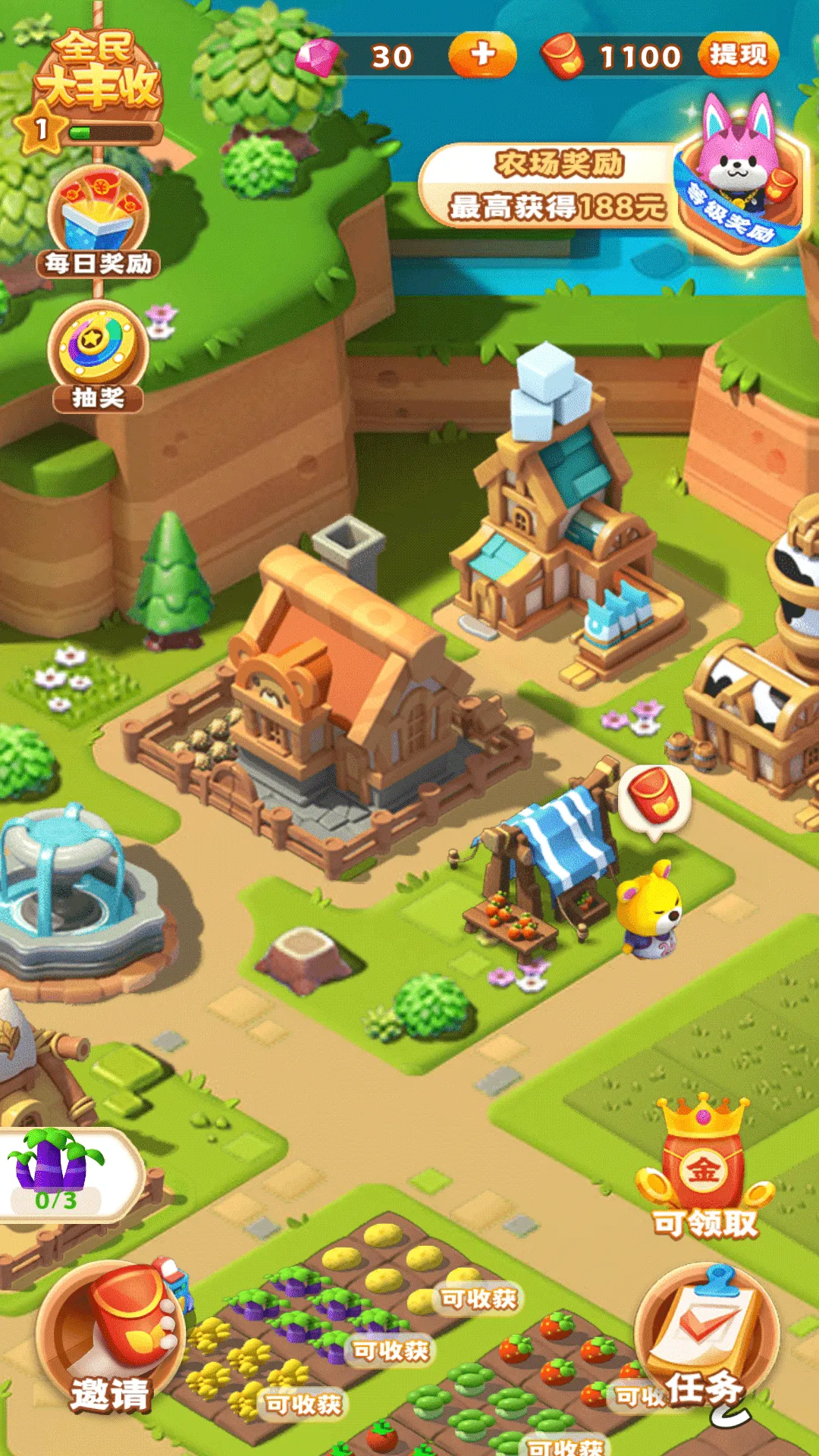 全民大丰收是一款红包版农场经营模拟休闲游戏。玩家化身农场主,通过种植养殖提升业务量,收集金币拓展农场。游戏有卡通画风、丰富场景作物,挂机系统,还有贸易中心等玩法,操作简单易上手,能让玩家体验经营乐趣并赚钱。