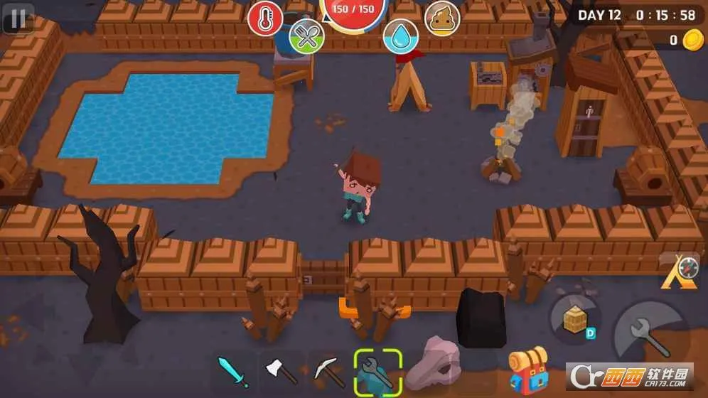 1、资源收集:游戏中资源丰富多样,涵盖木头、石头、铁、煤、沙子、骨头等基础资源,还有金银钻石红黄绿石等后期资源。玩家需操控角色在地图上探索,收集这些资源,用于制作工具、武器和食物。