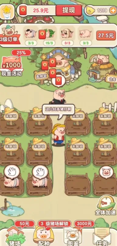 1、扮演养猪场主人,获取各类小猪悉心饲养,待其长大后出售赚取收益,所得资金用于升级养猪场及购买更高级猪崽。