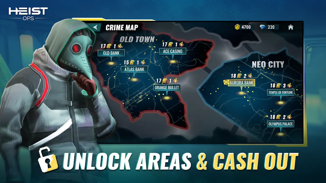 4. 逃脱与收集:在时间耗尽前逃脱并确保战利品安全,收集战利品解锁新英雄、升级装备,挑战更高难度劫案。