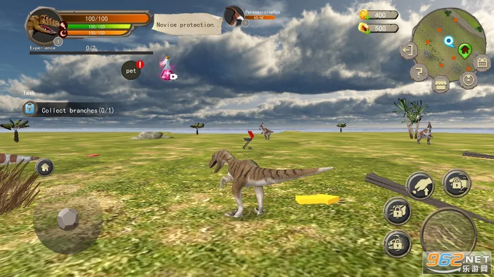 1、进入游戏,我们滑动屏幕可以看视野,左手变按钮控制走动,左上角是恐龙的状态,右上角是地图以及所在位置,右手边大按钮为攻击,其他分别控制头槌、咆哮、叼起、加速;