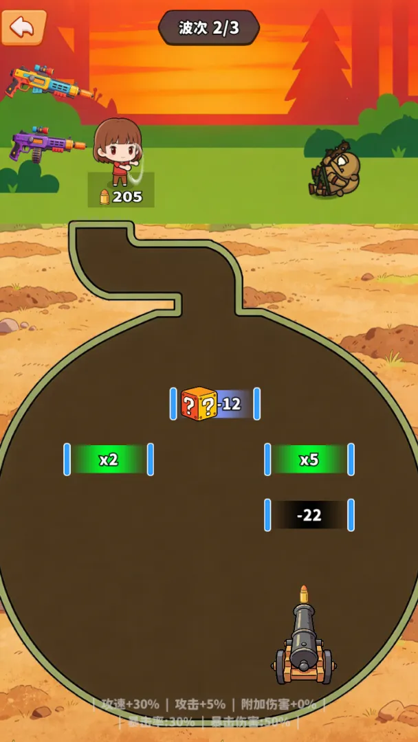 2、在矿道周围布置多种炮台,如火炮、冰炮和雷炮等,合理搭配发挥最大威力,防御地下怪物,炮台还能升级。