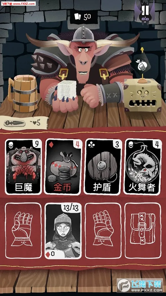 2、游戏超100张卡牌,涵盖武器、防具、魔法、怪物等类型,道具卡可回血,武器卡拖动攻击,合理组合卡牌是制胜关键。
