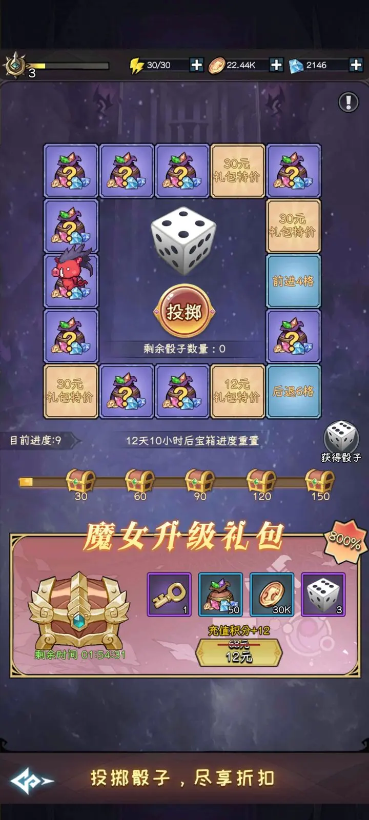 2、放置玩法 玩法以放置为主,击败魔物升级事件可选择魔女,升级一次事件能任意选一次。