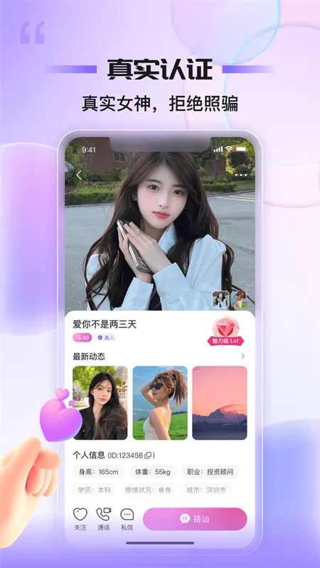 2、平台汇集海量真人用户,经过严格认证,资料真实可靠。有多样化交友方式,如语音、视频等,还能寻觅缘分信号找到有缘人。