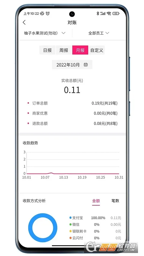 1、多门店集中管理:可对多门店收银员、收银设备等进行集中管理,不同角色不同权限,数据报表一体化