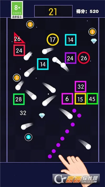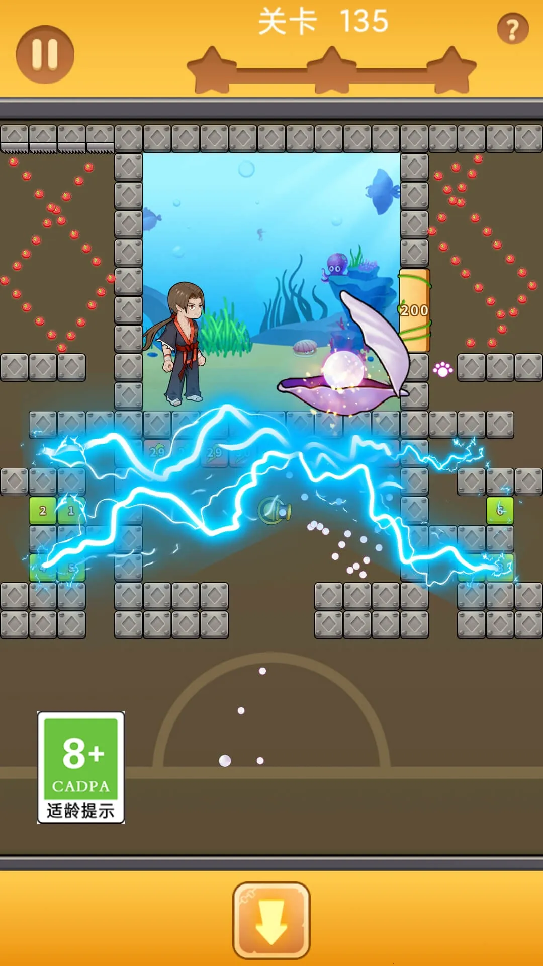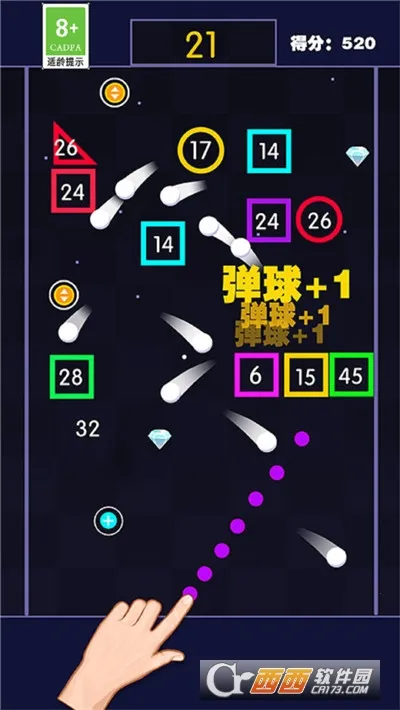 1、玩法类似打砖块,控制弹珠击碎方块,打入洞口有额外奖励。