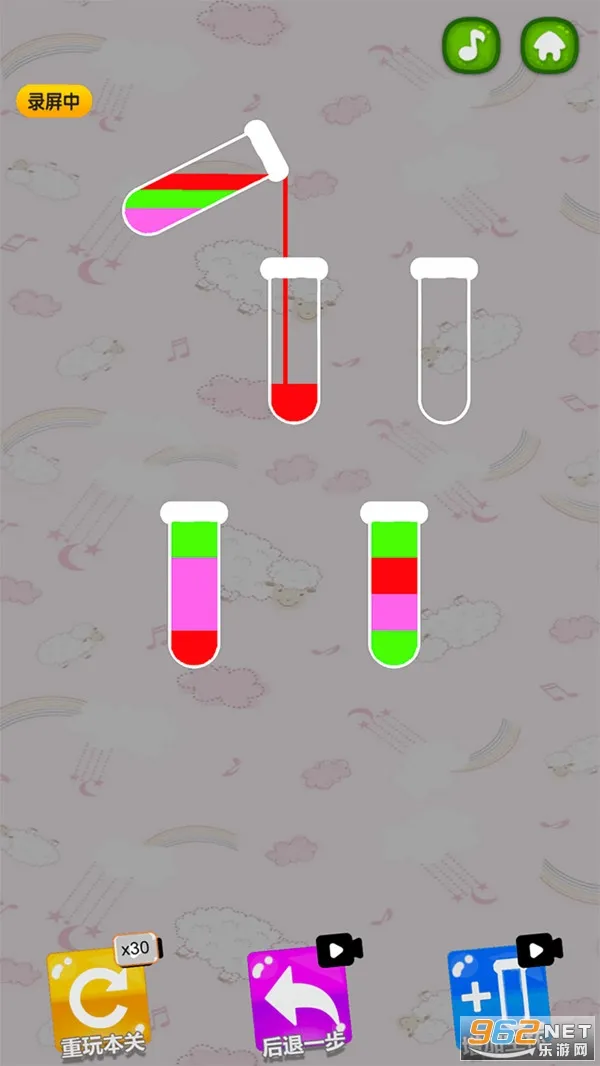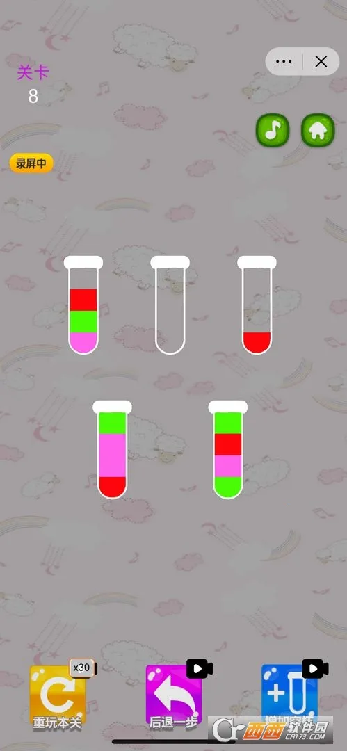 1、玩法:通过倒水来分隔混合液体,将相同颜色的水注入指定位置完成排序,规则是水颜色相同且目标玻璃杯有足够空间时才可倒水,点击玻璃杯即可倒水,可随时重启关卡。