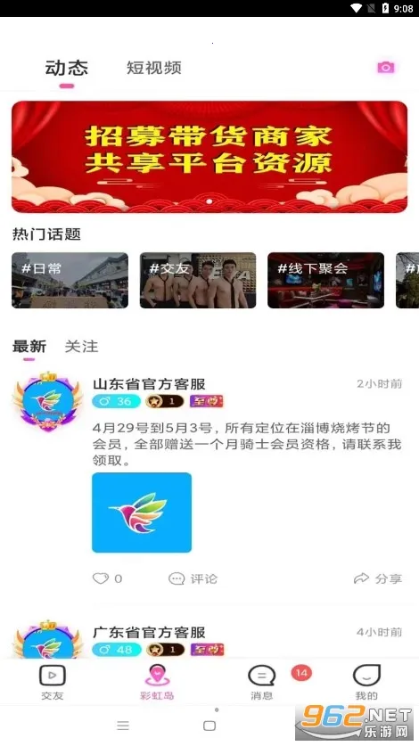 2、功能多元:支持发布动态、评论互动、附近推荐、私信聊天、关注网友等多种功能,还设有消息中心方便处理聊天消息。