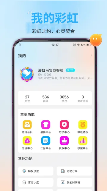 1、海量用户:彩虹鸟交友平台入驻了大量优质用户,为单身人士创造众多脱单机会,能助力他们高效交友找到灵魂伴侣。