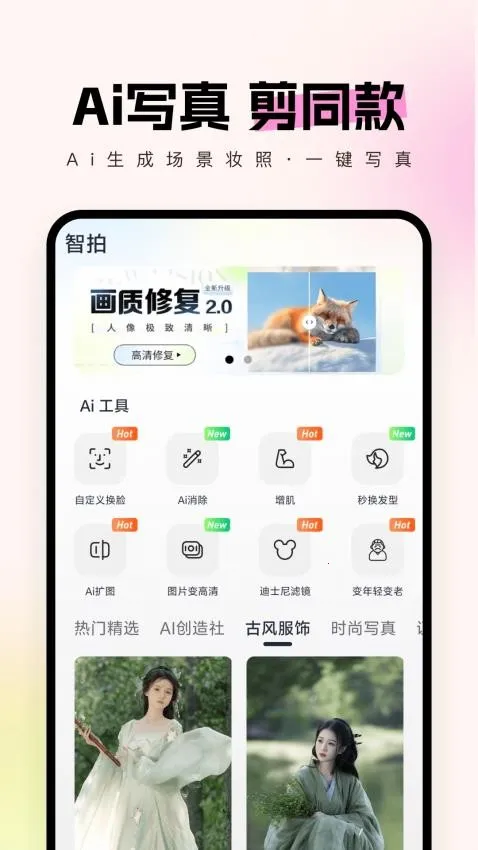 1、玩法多样:智拍官网版app支持一键体验多样化玩法,有AI写真、AI证件照等,还能一键换装,用户上传照片即可随心添加,简单操作就能生成喜欢的AI写真大片,实现趣味畅玩。