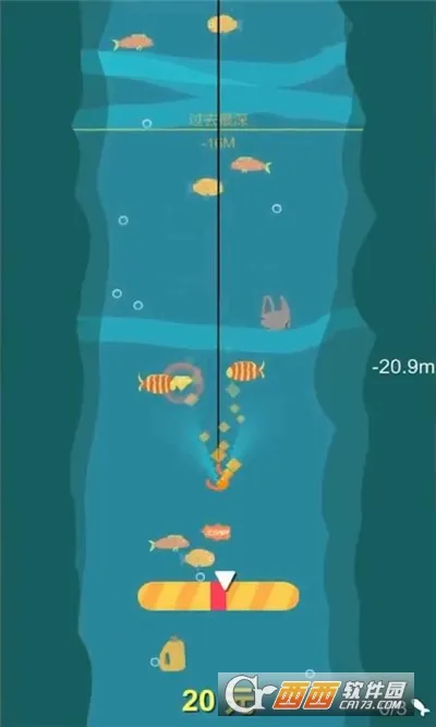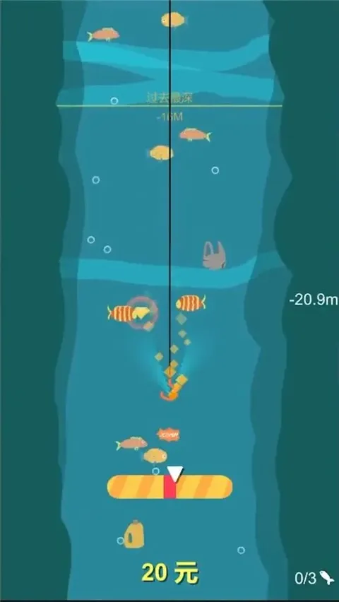 1、玩法轻松解压:《欢乐钓鱼佬》是模拟钓鱼的趣味休闲游戏,画面清新亮丽。玩家简单动动手指,控制吊钩下潜到一定深度就能钓取不同等级的鱼,完成丰富关卡任务,可很好地打发无聊时光。比如点击继续垂钓按钮开启挑战,控制吊钩到二十米深度捕获鱼类。