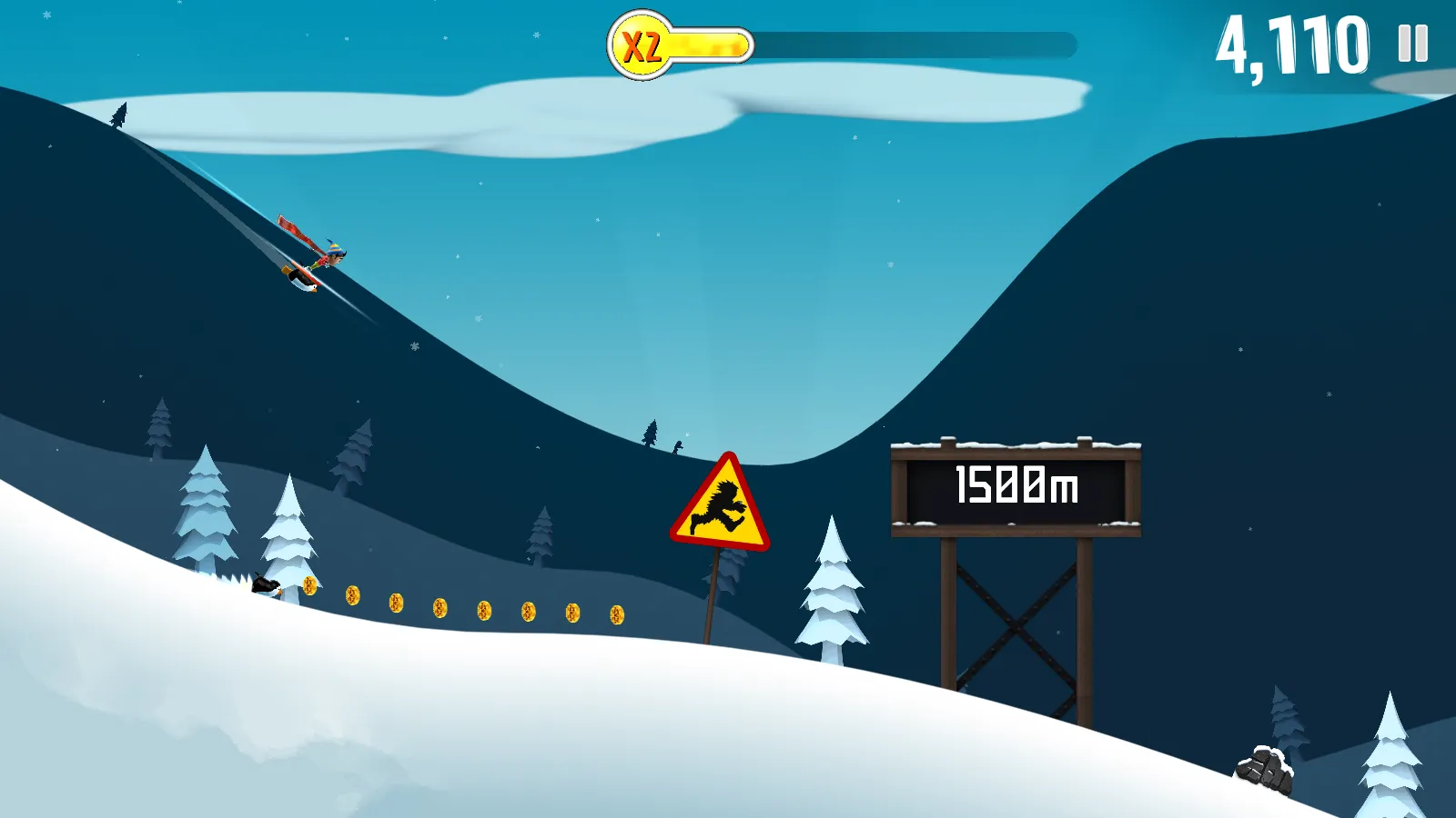 1、《滑雪大冒险》玩法丰富多样,有惊险的雪崩逃亡元素,玩家需操控角色躲避障碍、加速滑行,还能与可爱动物合作逃生,如老鹰带你飞行、雪人帮你抵消冲击,乐趣十足。