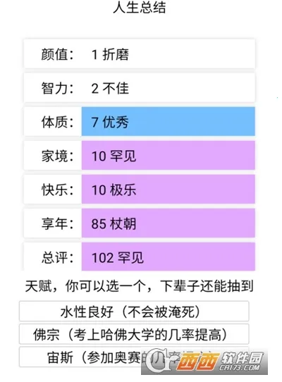 2、游戏特色鲜明,带来更多乐趣与玩法,玩家可拥有新的人生和天赋,每种天赋对应不同人生,好天赋能事半功倍。若失败还能无限重来,体验别样人生。
