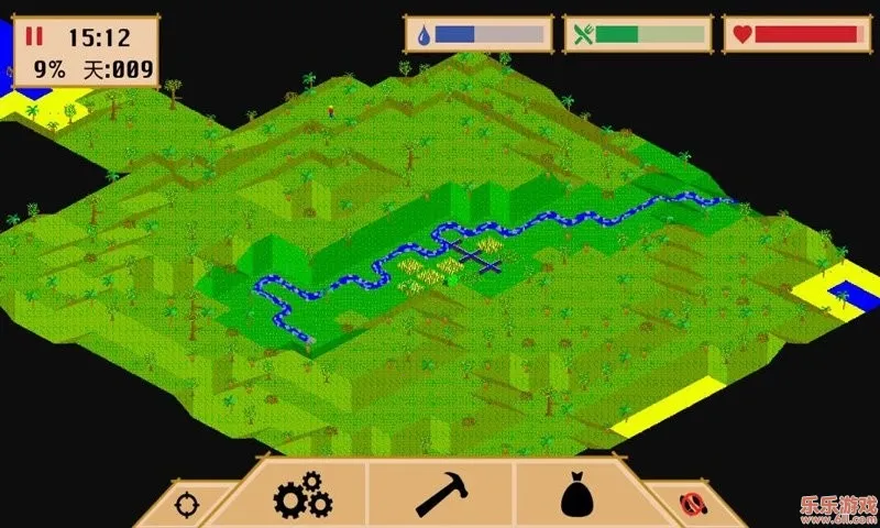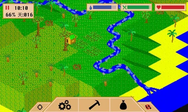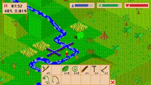 3、游戏特色与亮点:采用复古像素画面,集探索、采集、简易道具组装于一体。有真实生存压力,水分、食物和生命值见底角色死亡;可寻找野果、开辟农田、建设水渠实现自我供养;需不断探索创造,收集物品制作工具。