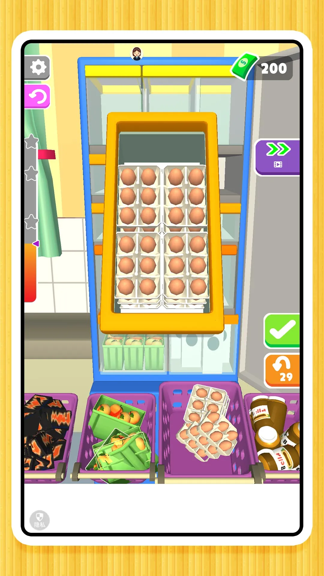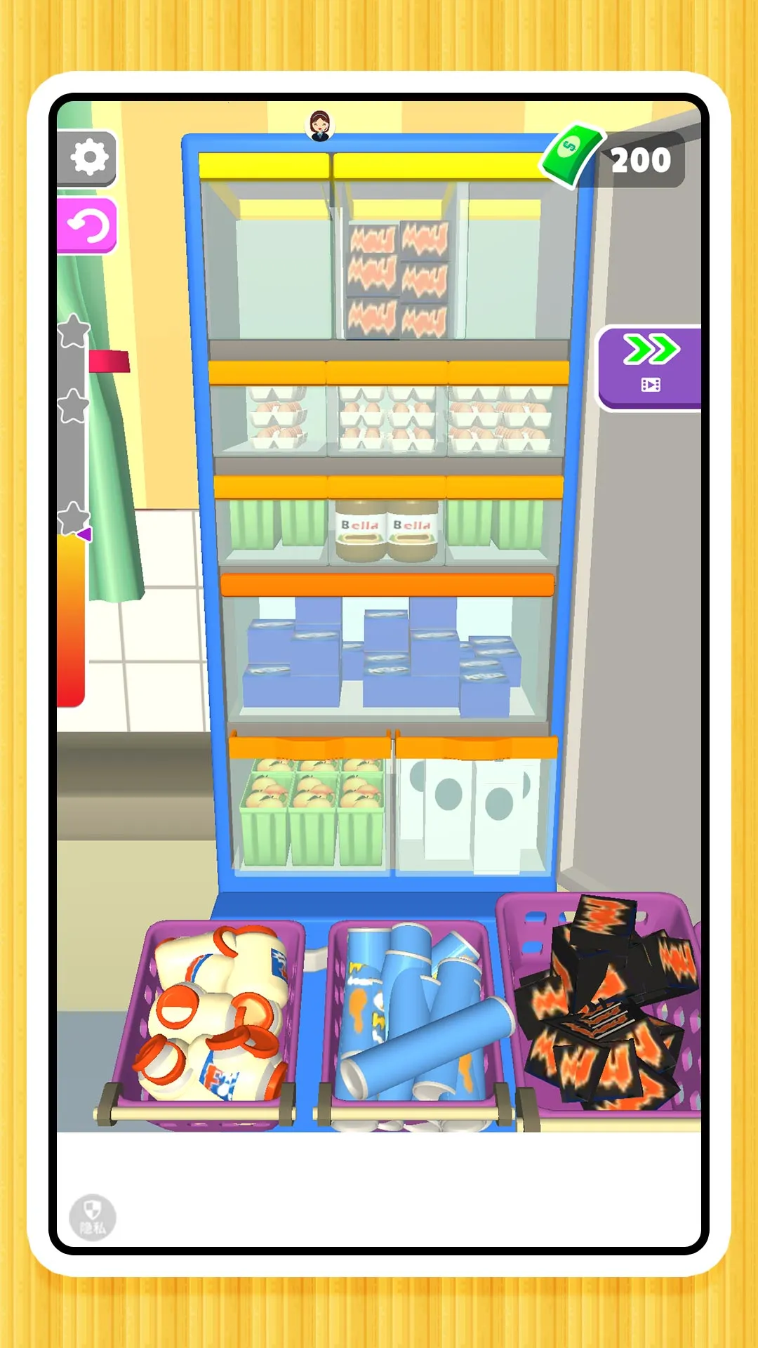 3、游戏具有一定策略性,要观察收纳容器,根据物品特性规划摆放位置,运用堆叠嵌套等技巧最大化利用容器容量,面对有限空间也能合理收纳。