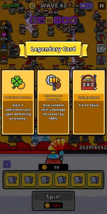 2、轻松操作体验:游戏操作轻松休闲,无需复杂指令输入,简单选择就能引导战局走向。玩家每一关通过击败从地图边缘进攻的敌人获得金币,用金币转动命运之盘,从随机三个技能中选一个。