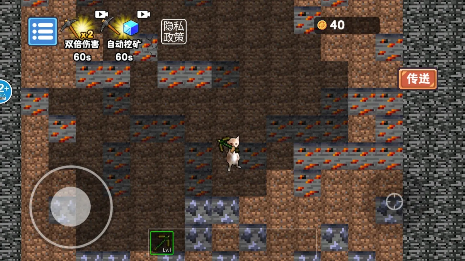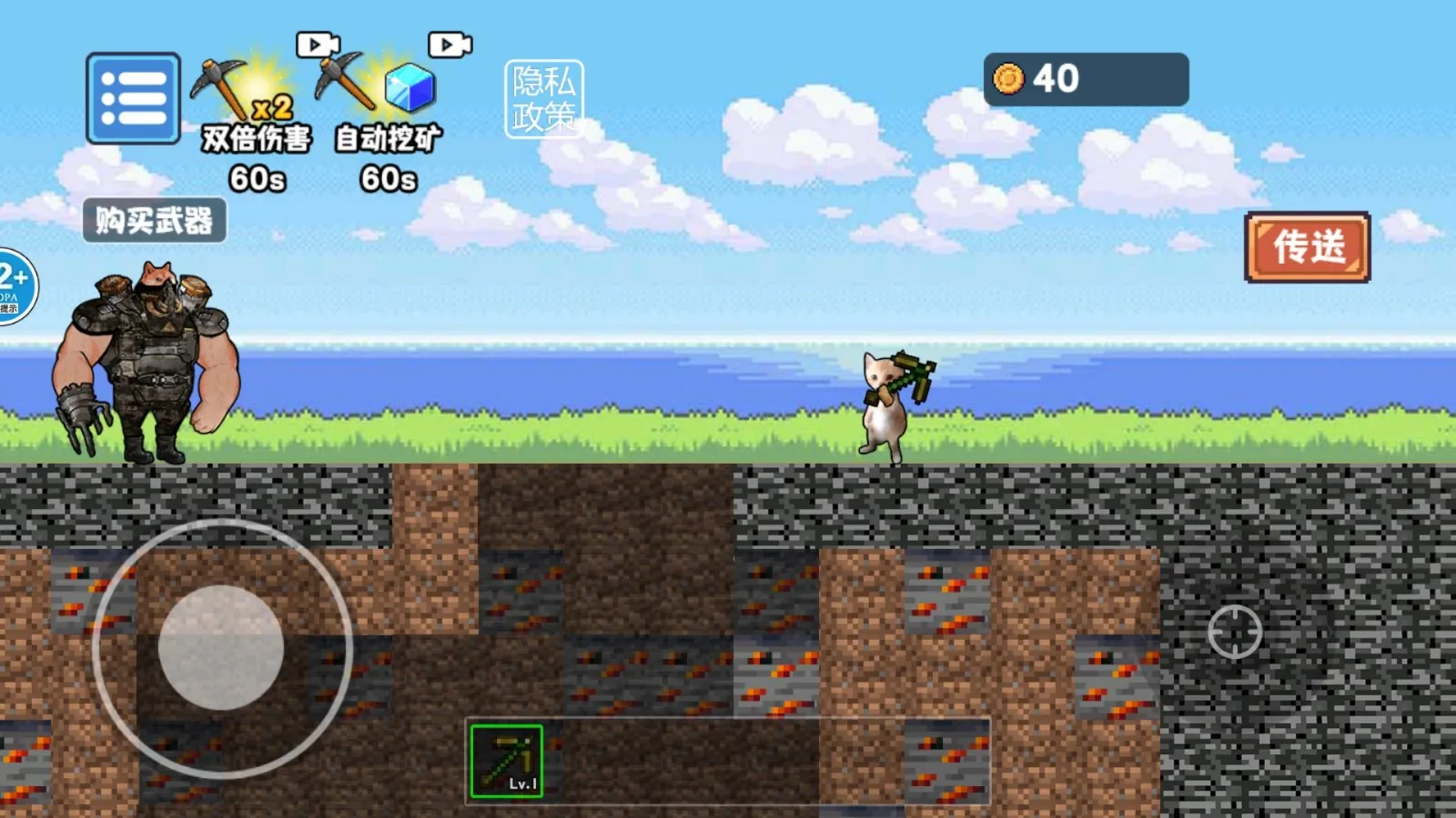 4、操作方式:用左侧虚拟摇杆控制行动,右侧控制挖矿;在武器商店买道具,等级越高挖矿越轻松;点击攻击按钮挖矿,耗尽矿石血条收集矿产;深入地底后可点击传送回矿山顶部。
