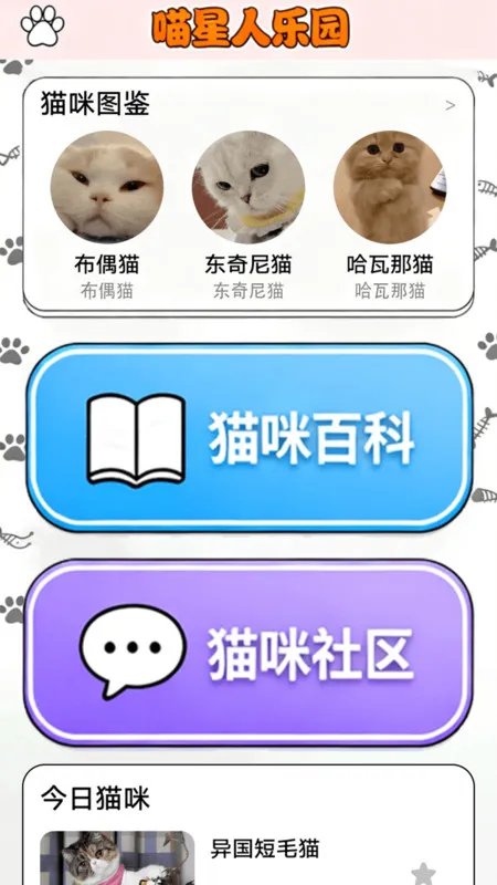 2、其玩法多样,在喵星人乐园能了解猫咪图鉴、百科、社区等内容;在猫咪社区可享受不同视频的精彩与互动乐趣;在猫咪管家页面能进行喂食记录、健康追踪等操作;在猫咪互动页面可进行寻找猫咪游戏、猫咪变声器等操作。