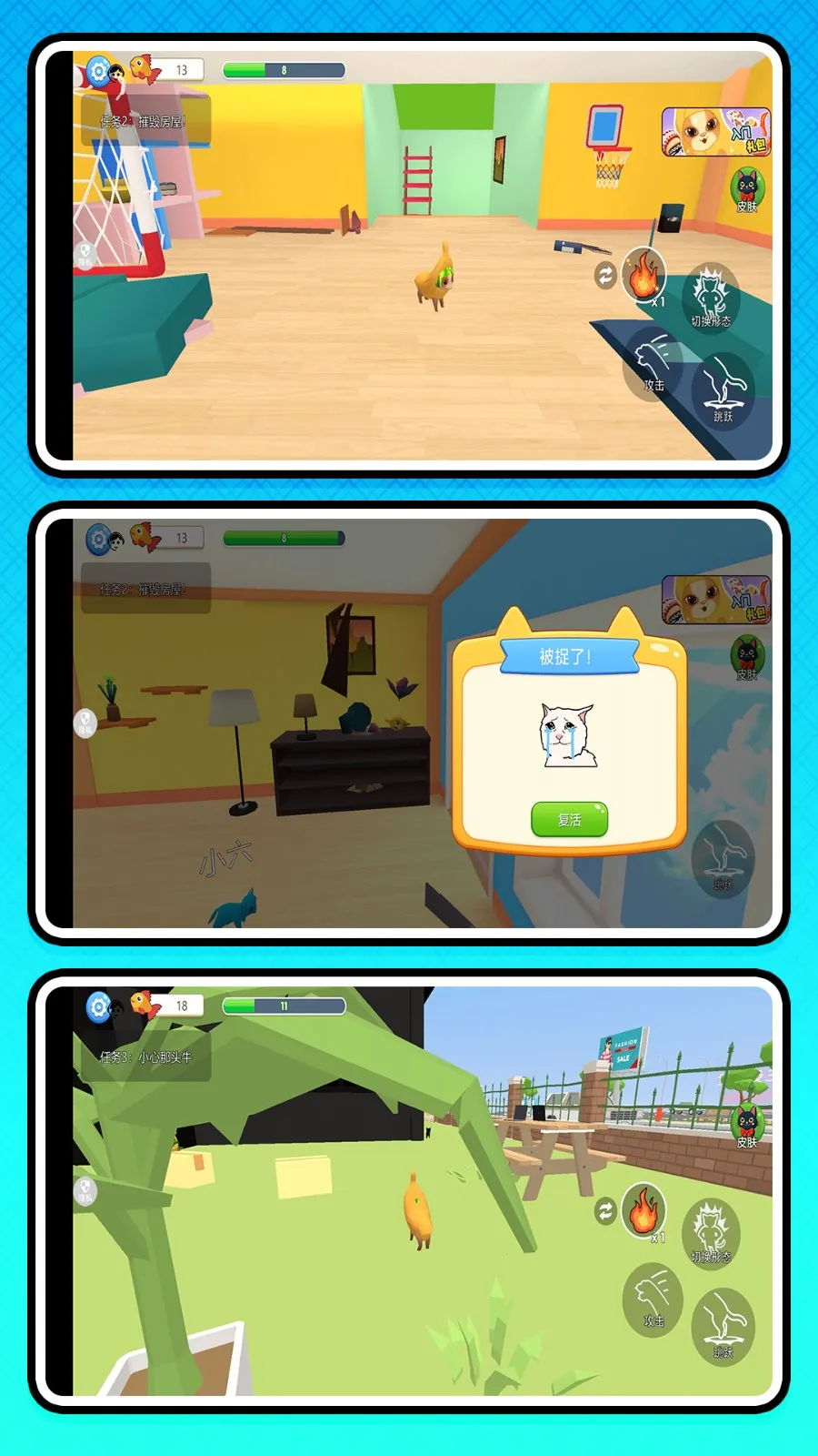 4、操作指引:任务前选喜欢的猫咪并熟悉特性;通过跳跃互动,快速收集任务道具;边破坏边躲避人类追击逃离现场;积累奖励兑换皮肤、开启新模式提升体验。