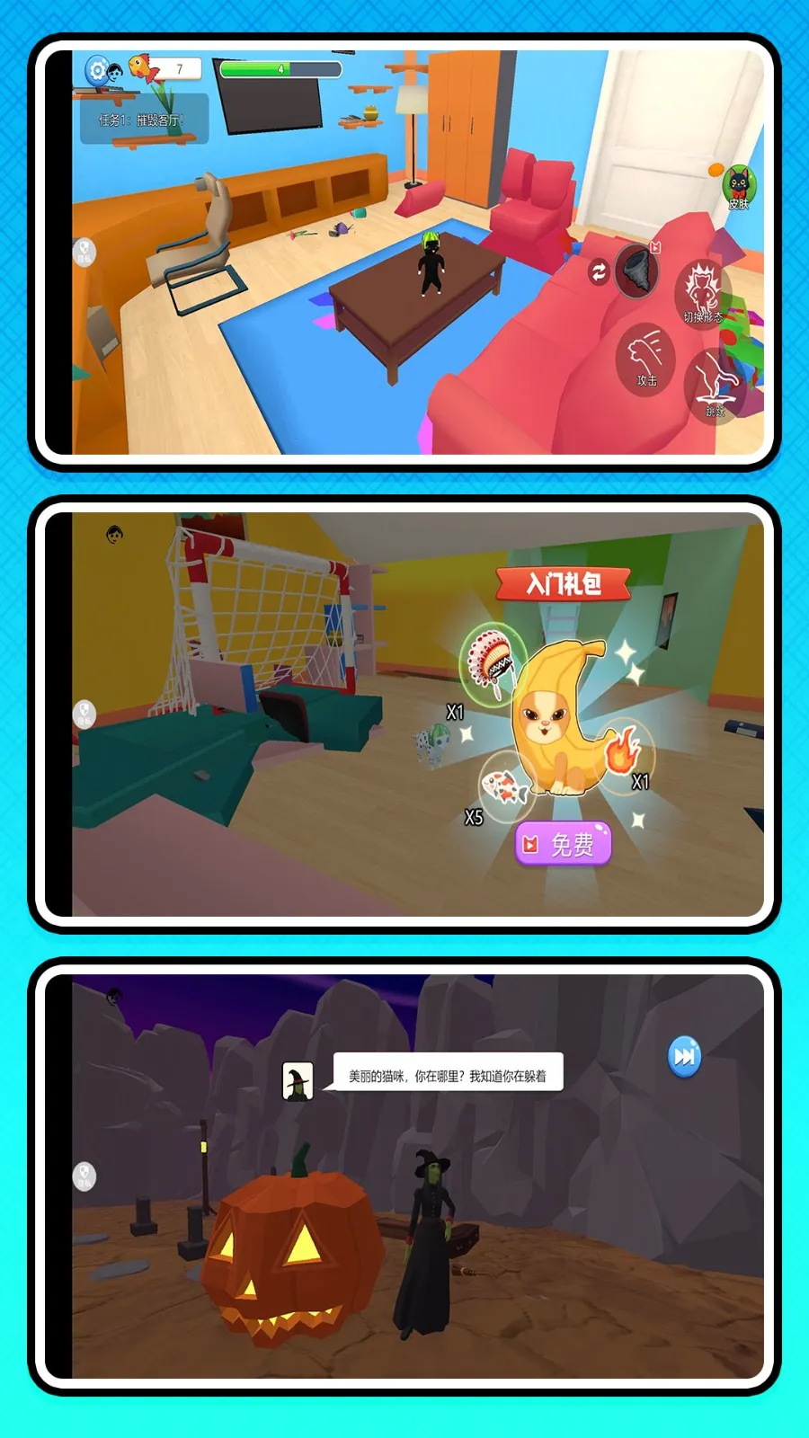 2、亮点十足:积累破坏积分或完成任务可解锁新场景、猫咪皮肤和特殊破坏动作;场景万物皆可互动,部分互动触发隐藏剧情或惊喜效果;支持自定义猫咪外观,增添收藏乐趣。