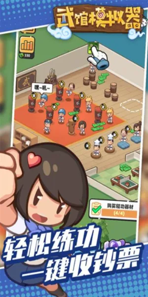 2、多样玩法机制:有练功区开发、宣传招生、器材商店购买、武馆装饰布置、秘籍学习等玩法,学员数量是经济基础,训练不局限于外部体质。
