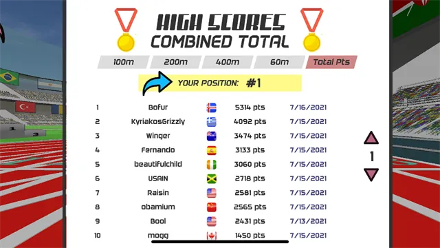 2、特色亮点突出:支持与全球玩家实时竞速,赛后可查看全球排行榜名次变化;完整版解锁五个经典田径比赛项目;有电影级镜头回放功能,可切换八个体育场主题。
